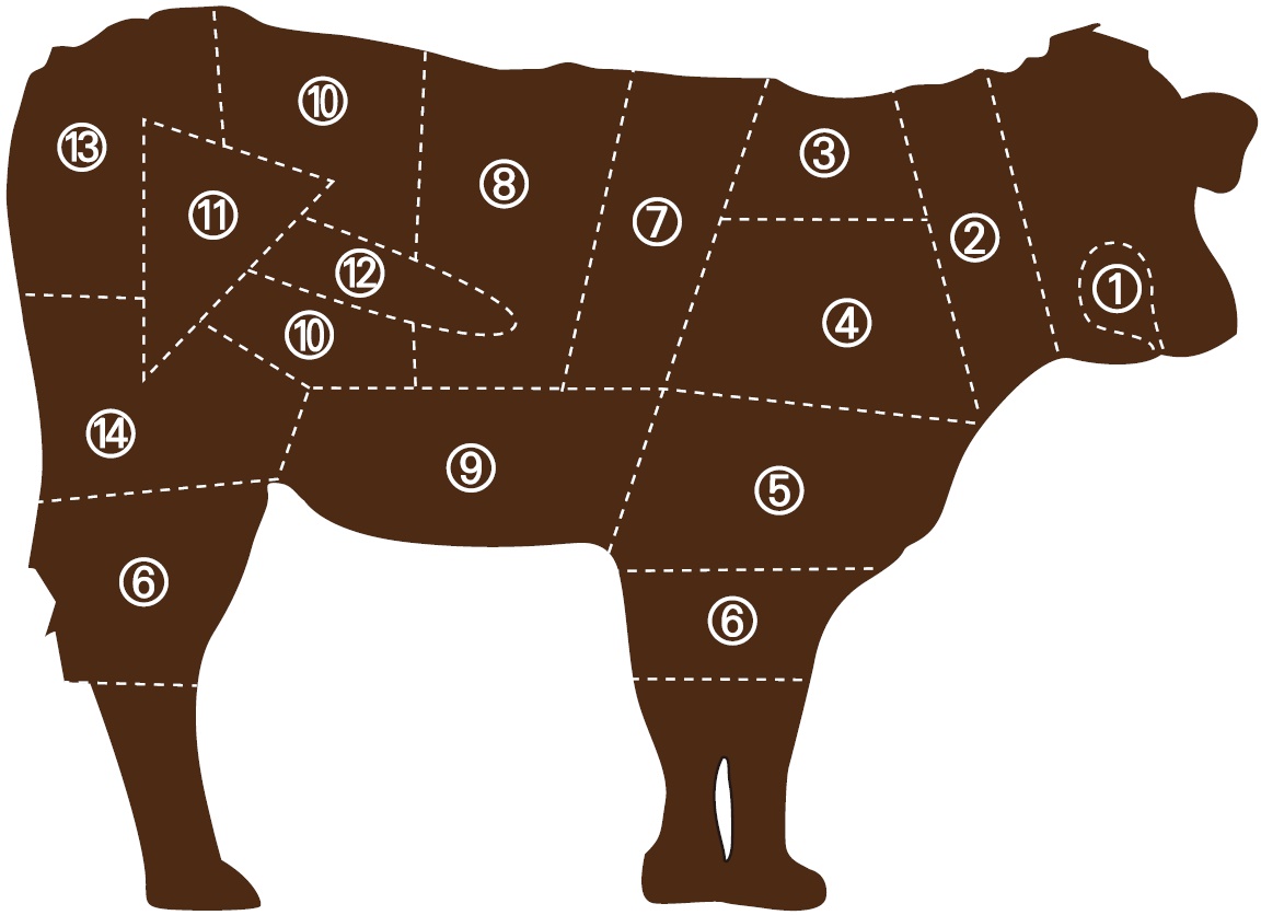 ⑪ うちもも (우치모모 (허벅지)) ⑫ ヒレ (히레 (안심)) ⑬ そともも (소토모모 (설도)) ⑭ しんたま (신타마 (치맛살))